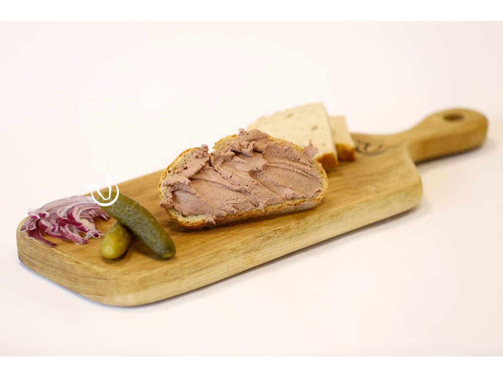 pečené vepřové sádlo 37%, vepřová játra 28%, pitná voda, solící směs (jedlá sůl, konzervant: dusitan sodný, jodičnan draselný), vláknina: bambusová, bramborová, citrusová, extrakty koření, zahušťovadlo E466, koření, jedlá sůl, restovaná cibule, bylinky, sušená jablečná šťáva, sušená šťáva z pomeranče, extrakt z papáji, smažená cibule (cibule, palmový olej, mouka, jedlá sůl).