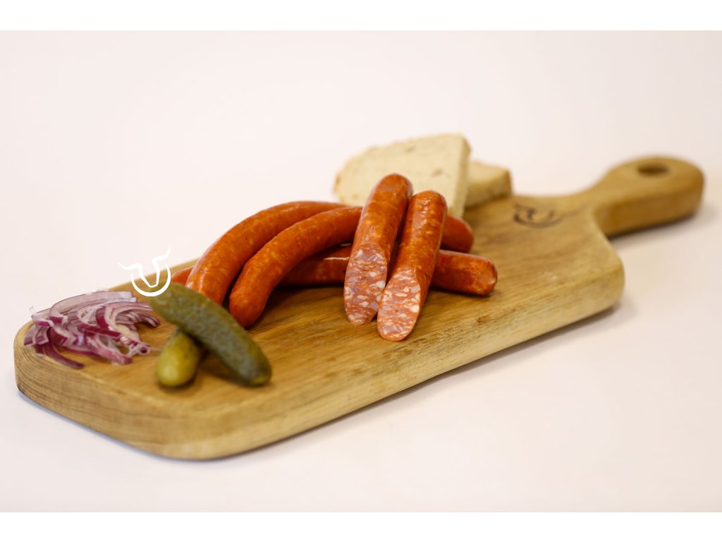 vepřové maso 77%, hovězí maso 15%, pitná voda, kolegenní střívko, solící směs (jedlá sůl, konzervant: dusitan sodný, jodičnan draselný), směs koření, česnek, maltodextrin, antioxidant: kyselina askorbová, aroma.