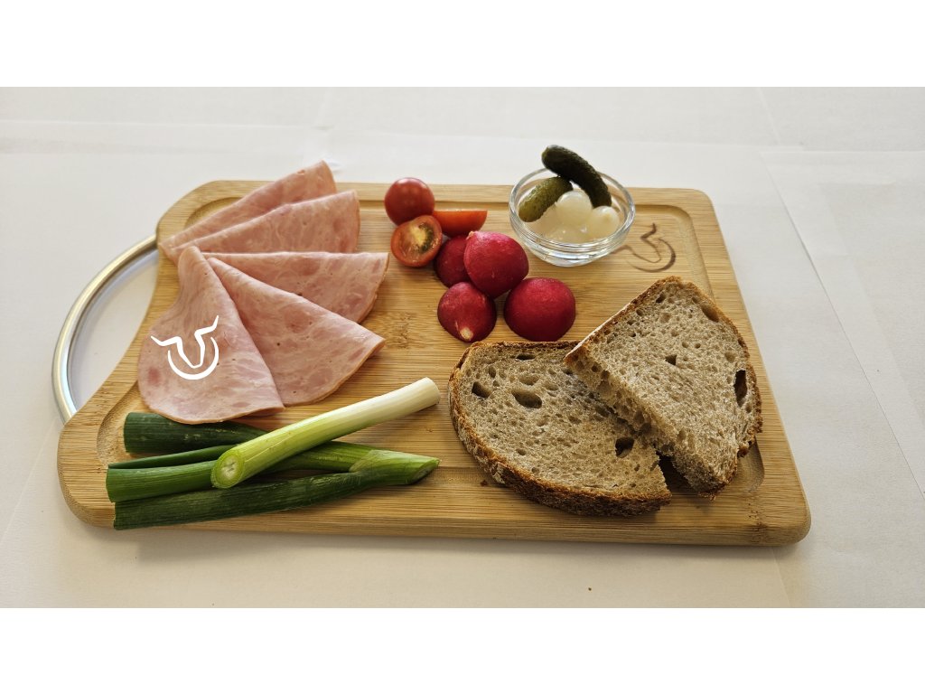 vepřové maso 95%, pitná voda, solící směs (jedlá sůl, konzervant: dusitan sodný, jodičnan draselný), stabilizátory E450, antioxidanty E300, dextróza, jedlá sůl, koření, exkrakty koření