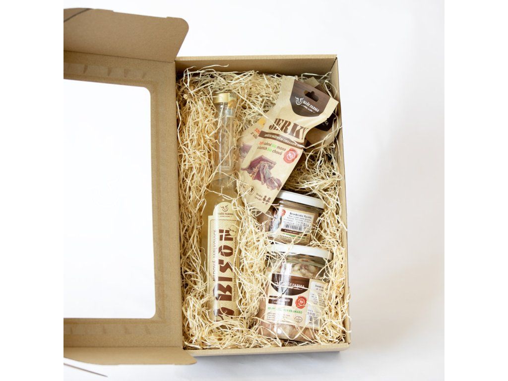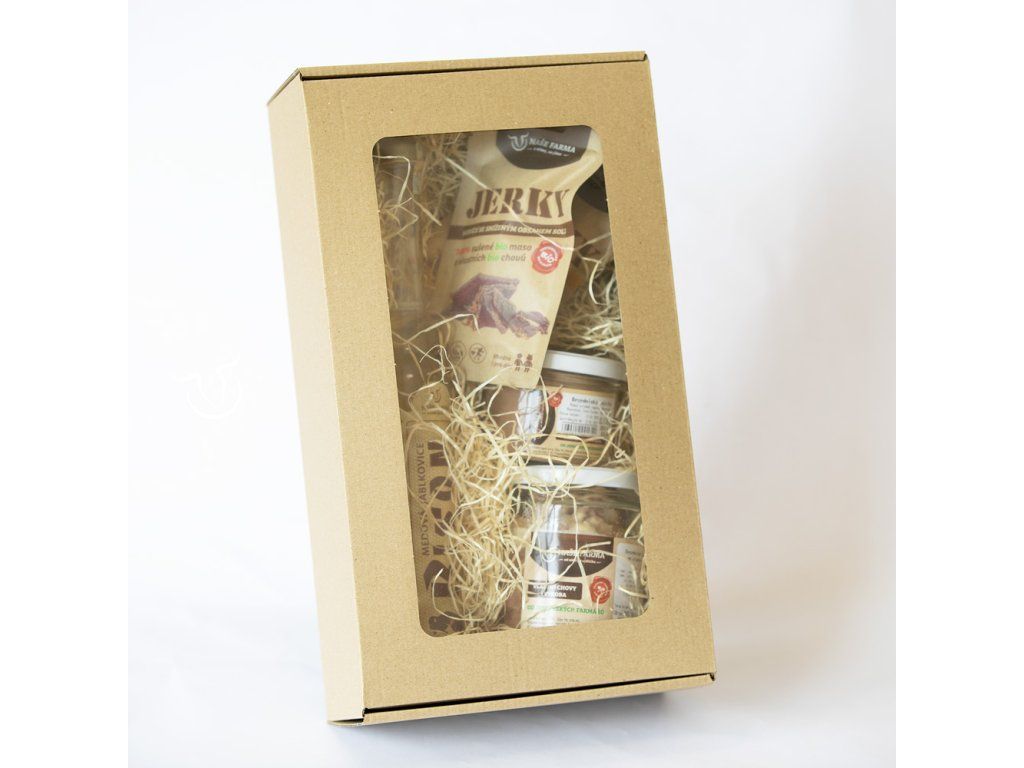 Dárkový balíček s hovězím jerky, medovou jablkovicí, besednickou paštikou a vepřovým ve vlastní šťávě. Ideální jako dárek i pro slavnostní příležitosti.