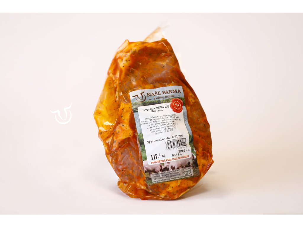 - Složení: vepřová krkovice, marináda: rostlinný olej (řepkový, palmový-neztužený), koření, sůl, aroma, kořenící extrakt.